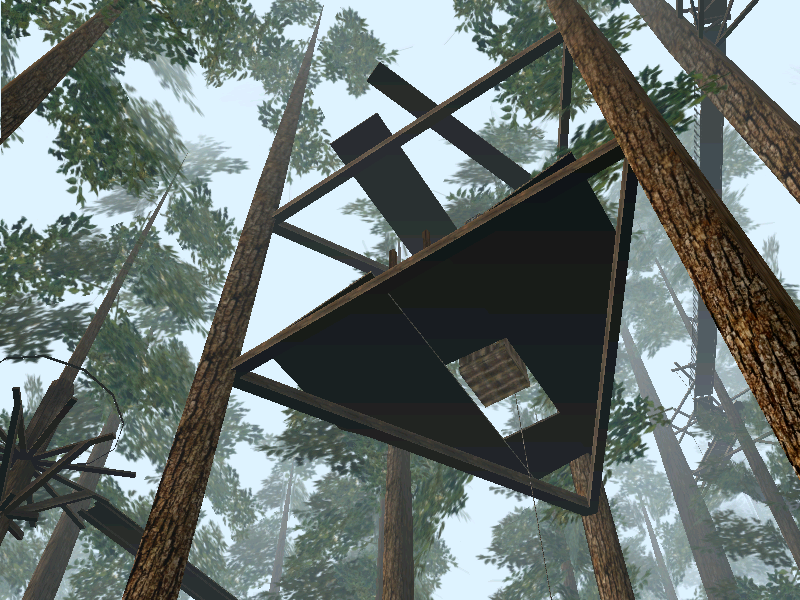 Outside the tree border, there is a small island with a windmill on it. Inside there was a large water tank and a valve. After turning the valve, I can hear the sound of water running inside the pipes. At a lot of walkway crossings there is a valve to let the water flow in either direction. The water in turn powers different machines that gives power to an elevator for instance.